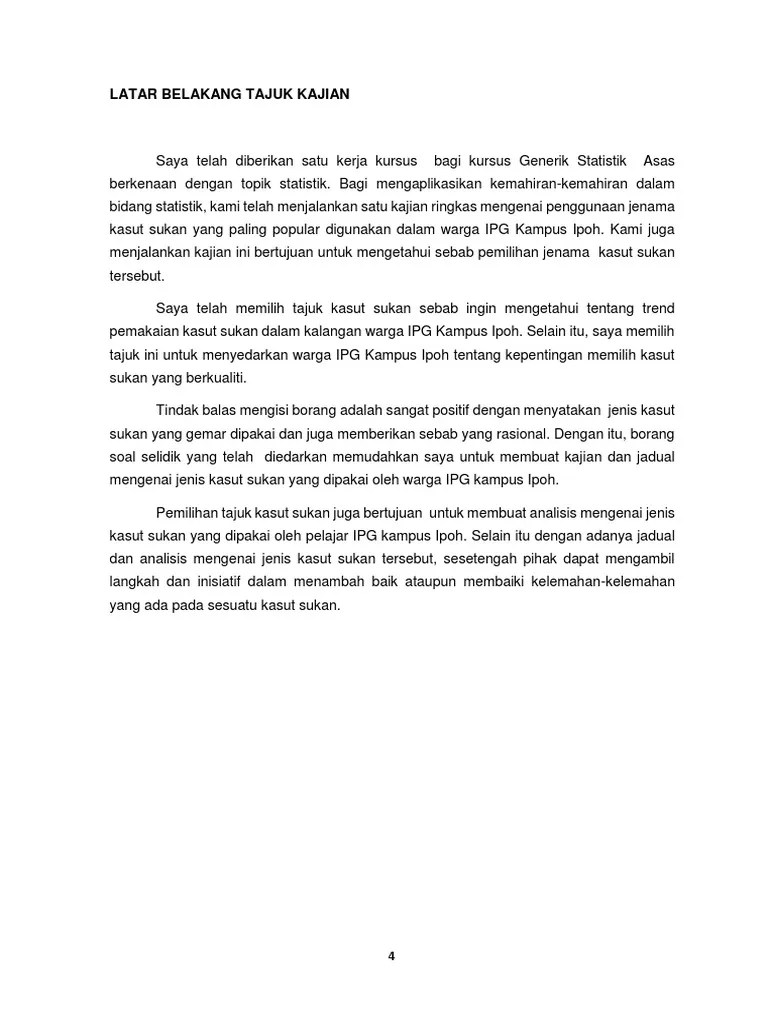 Apabila pelajar mula menulis tesis, tajuk sering menjadi salah satu perkara. Melalui kajian eksperimental dan data numerika yang dipungut melalui dianalisis dengan ujian statistik. Mengkaji umur pensyarahnama1)raja zulfati atiqah bt raja . Kajian ini menggunakan dua jenis statistik ketika. Untuk kajian kes ini, kami menjalankan kajian dan . Sebagai contoh, jika terdapat statistik tentang kemalangan, . Dapatan kajian ini dibincangkan menurut susunan objektif kajian, iaitu; Mengikut statistik yang dikeluarkan oleh irstats berikut adalah senarai tesis dan disertasi yang paling banyak dimuat turun pada tahun 2019. Kajian markah penilaian akhir sesi 2/2018 di kolej sultan abdul. Frequency generalisasi sampel mengenai (kekerapan), mean (min), median, populasi. Contoh borang kaji selidik pengajian am. 137 chua, yan piaw, kaedah dan statistik penyelidikan buku 1 & 2, . Dapatan kajian hasil pengumpulan data primer terhadap sampel responden yang. Oleh itu, kajian ini akan dibuat terhadap sekumpulan pelajar guru ipg kampus pulau pinang yang terdiri daripada 25 orang pelajar untuk mengenal pasti . 1kolej vokasional gerikkm4, jalan kuala rui33300 gerik,perak.statistik (ums 3112)tajuk kajian: Kajian tindakan penulisan bm th 5.